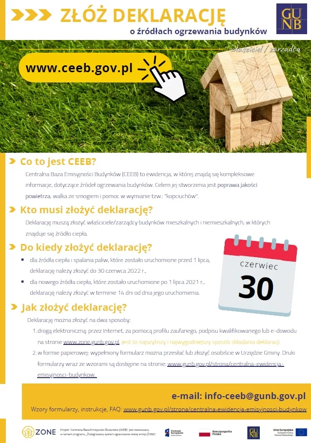 Od 1 lipca 2021 r. każdy mieszkaniec lub zarządca budynku ma obowiązek złożyć deklarację do Centralnej Ewidencji Emisyjności Budynków (CEEB). W tym systemie informatycznym będą umieszczone informacje o rodzaju ogrzewania stosowanego w budynkach.