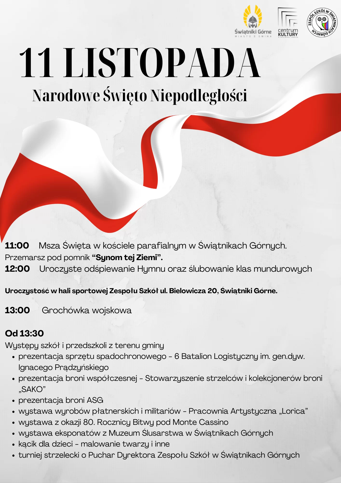 Burmistrz Miasta i Gminy Świątniki Górne Małgorzata Duży Dyrektor Centrum Kultury w Świątnikach Górnych Martyna Strączek Dyrektor Zespołu Szkół w Świątnikach Górnych Aleksandra Bobińska zapraszają na uroczyste obchody Narodowego Święta Niepodległości