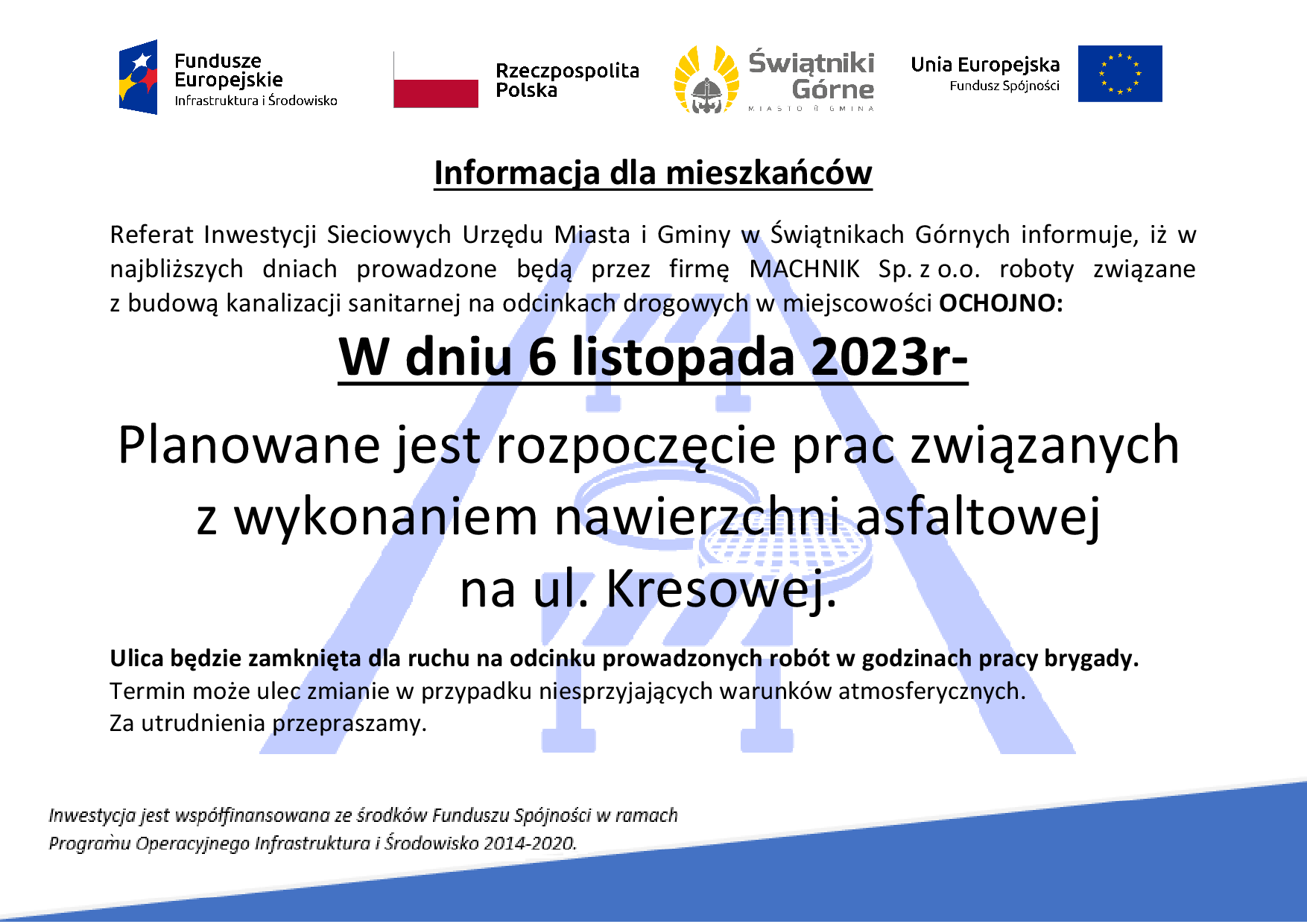 Referat Inwestycji Sieciowych Urzędu Miasta i Gminy w Świątnikach Górnych informuje, iż w najbliższych dniach prowadzone będą przez firmę MACHNIK Sp. z o.o. roboty związane z budową kanalizacji sanitarnej na odcinkach drogowych w miejscowości OCHOJNO: