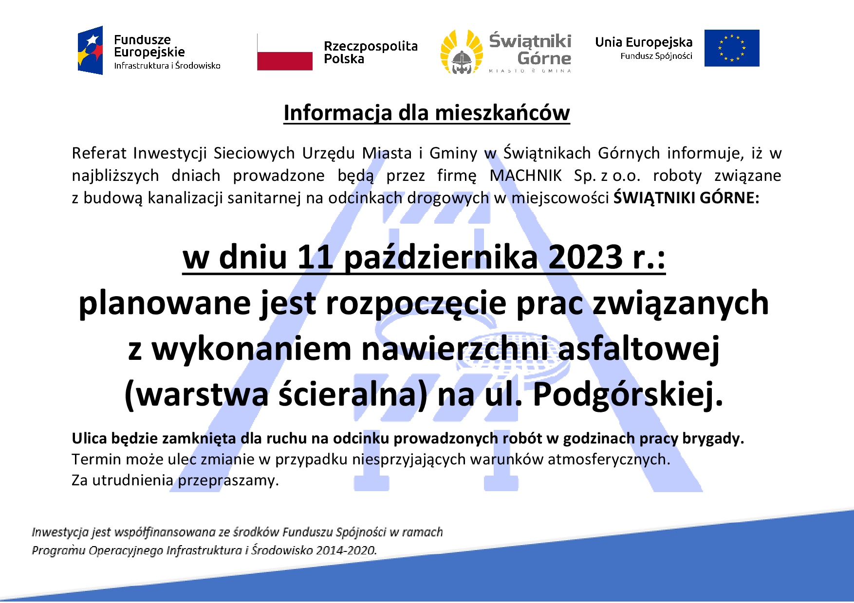 Referat Inwestycji Sieciowych Urzędu Miasta i Gminy w Świątnikach Górnych informuje, iż w najbliższych dniach prowadzone będą przez firmę MACHNIK Sp. z o.o. roboty związane z budową kanalizacji sanitarnej na odcinkach drogowych w miejscowości ŚWIĄTNIKI GÓRNE: