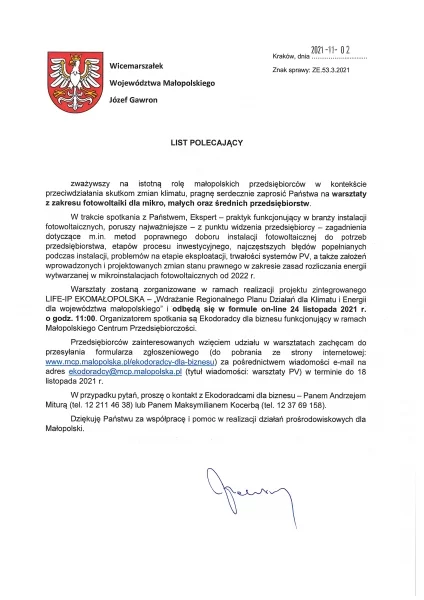 Zapraszamy przedstawicieli mikro-, małych i średnich przedsiębiorstw z województwa małopolskiego, zainteresowanych montażem nowej instalacji PV lub rozbudową już istniejącej.