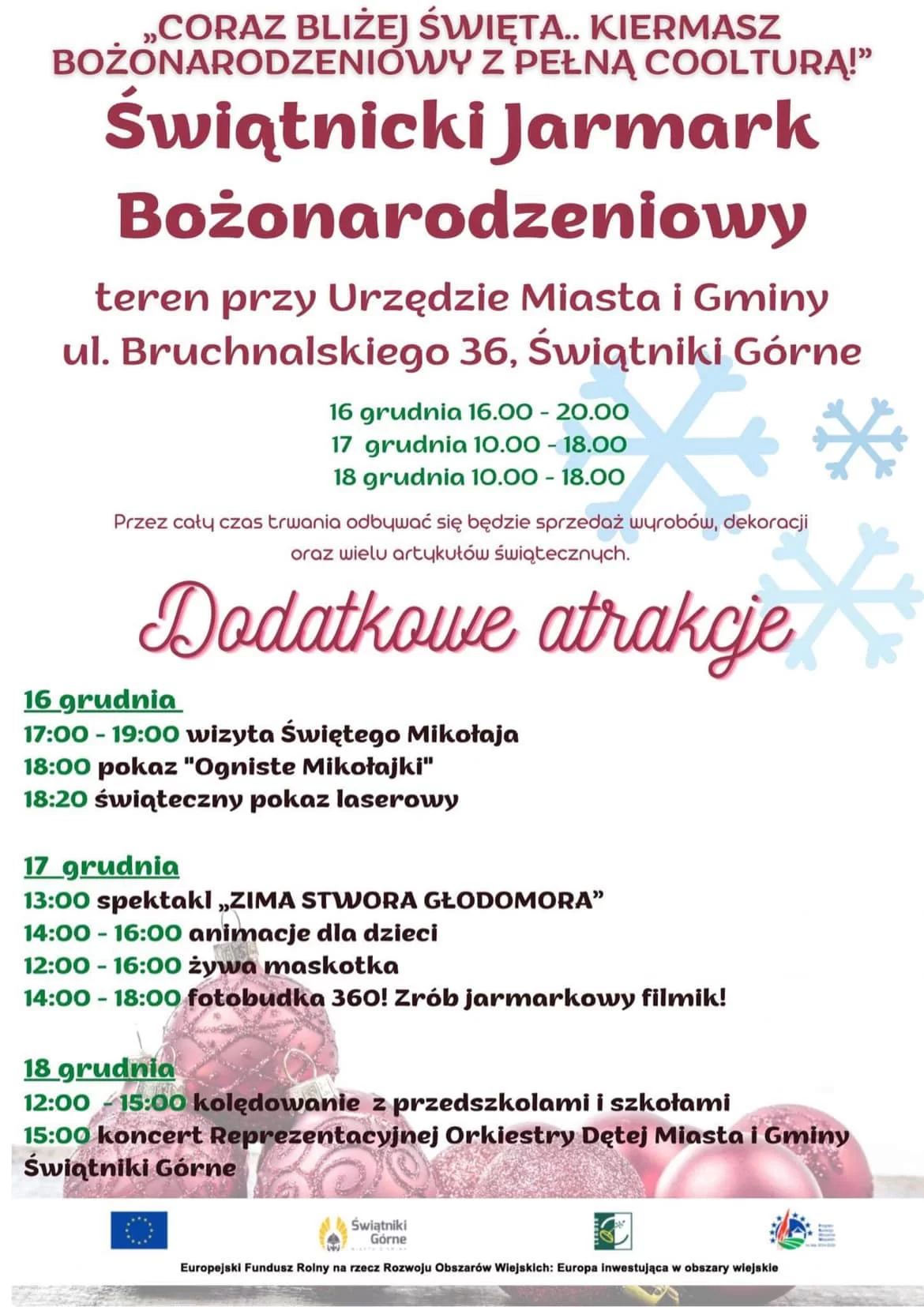 Zapraszamy na III Świątnicki Jarmark Bożonarodzeniowy w dniach 16 grudnia br. 16.00-20.00 17 grudnia br. 10.00-18.00 18 grudnia br. 10.00-18.00
