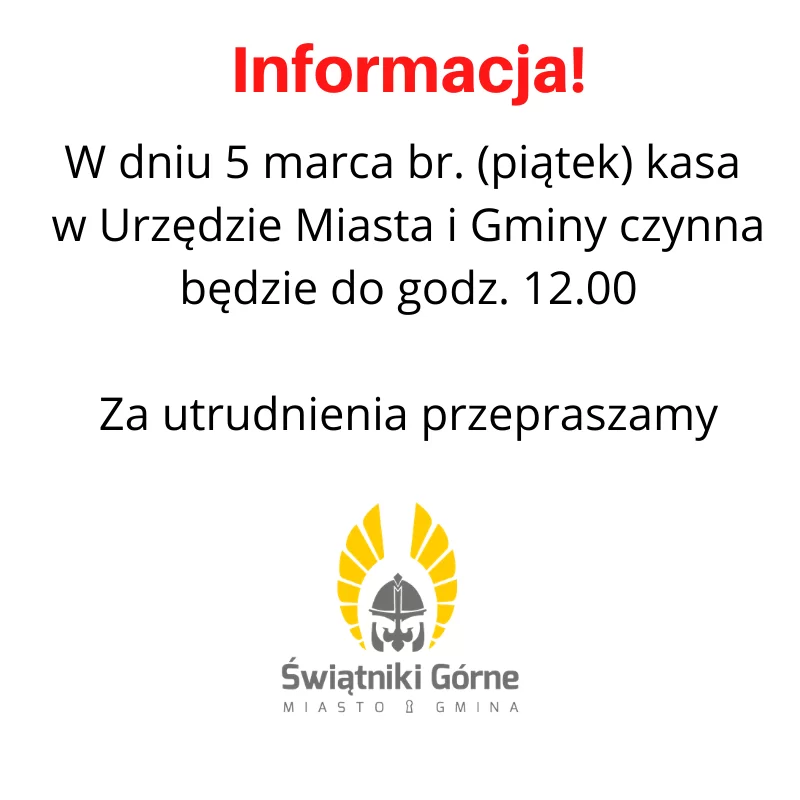 W dniu 5 marca br. (piątek) kasa w Urzędzie Miasta i Gminy czynna będzie do godz. 12.00 Za utrudnienia przepraszamy