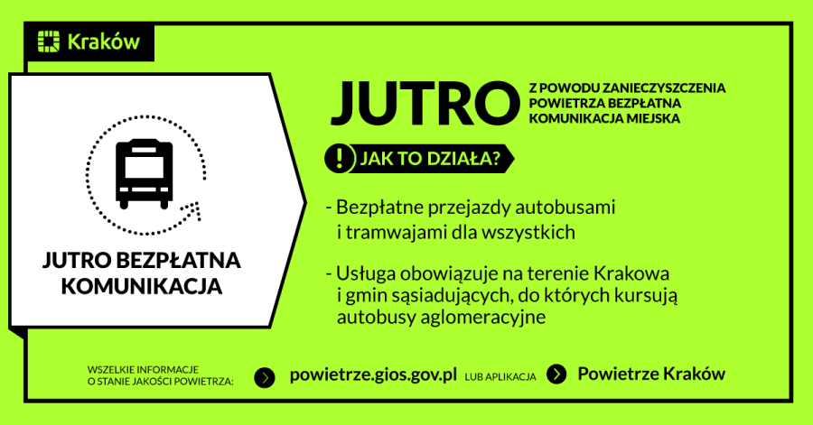 Ze względu na prognozę przekroczenia średniego poziomu zanieczyszczenia powietrza dla pyłu PM10, Centrum Zarządzania Kryzysowego Miasta Krakowa zainicjowało wprowadzenie bezpłatnej komunikacji jutro, 10 stycznia, od godz. 0.00 do godz. 24.00, dla pasażerów korzystających z komunikacji miejskiej w Krakowie.