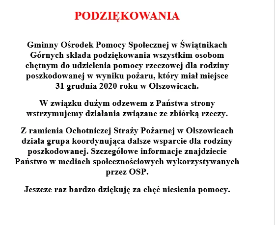 Gminny Ośrodek Pomocy Społecznej w Świątnikach Górnych składa podziękowania wszystkim osobom chętnym do udzielenia pomocy rzeczowej dla rodziny poszkodowanej w wyniku pożaru, który miał miejsce 31 grudnia 2020 roku w Olszowicach.