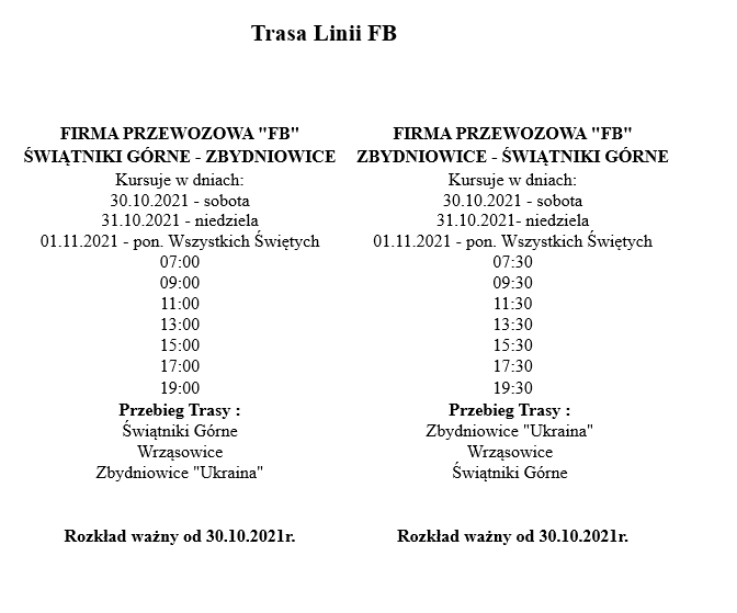 Informujemy, że w okresie Wszystkich Świętych od dnia 30.10.2021 do dnia 01.11.2021 (sobota, niedziela, poniedziałek) Firma Transportowa FB uruchamia przewóz osób na trasie: Świątniki Górne - Zbydniowice - Zbydniowice - Świątniki Górne. Bus będzie kursował według poniższego rozkładu. 🚐