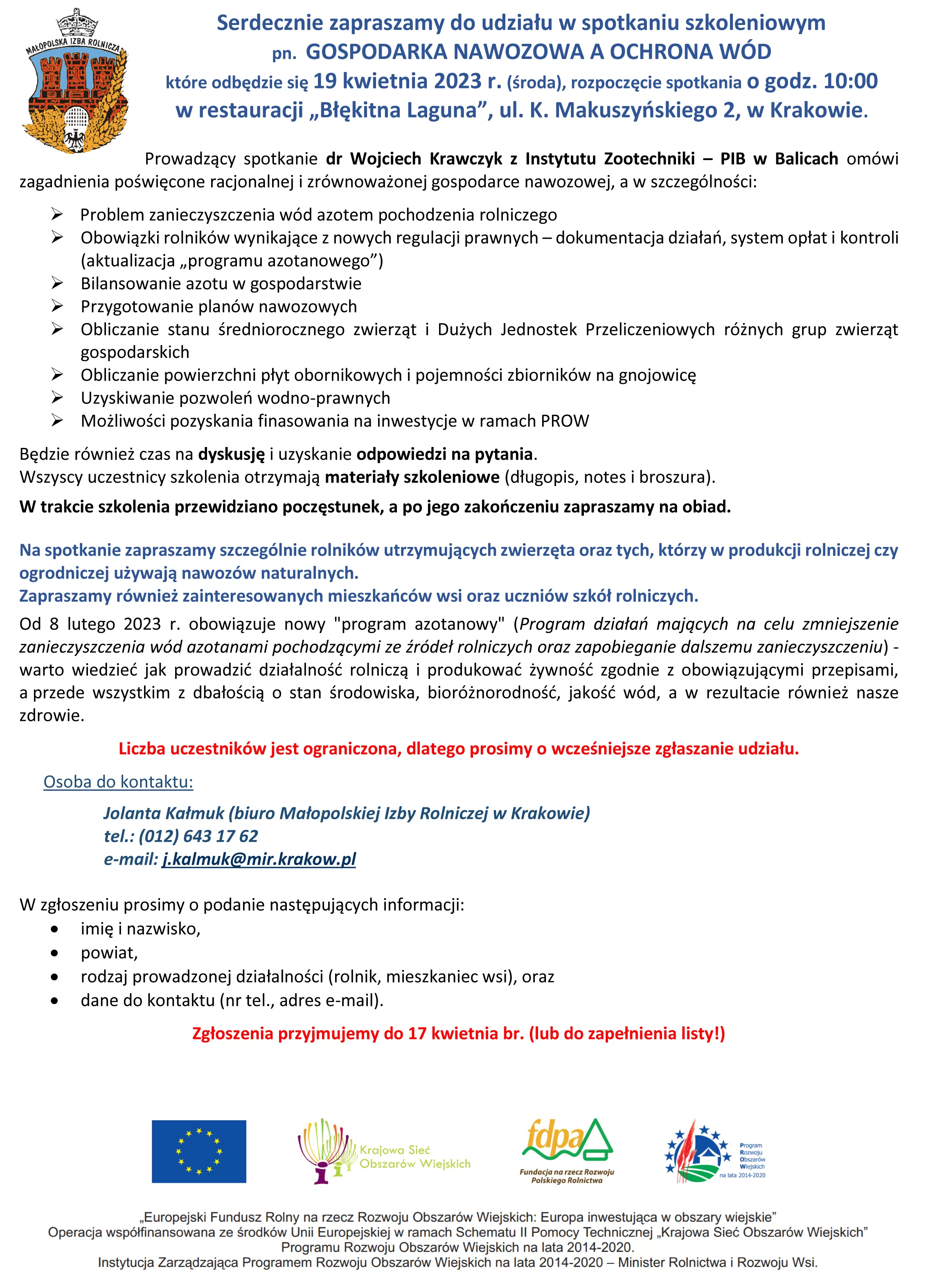 Małopolska Izba Rolnicza zaprasza do udziału w spotkaniu szkoleniowym pn. GOSPODARKA NAWOZOWA A OCHRONA WÓD które odbędzie się 19 kwietnia 2023 r. (środa), rozpoczęcie spotkania o godz. 10:00 w restauracji „Błękitna Laguna”, ul. K. Makuszyńskiego 2, w Krakowie.