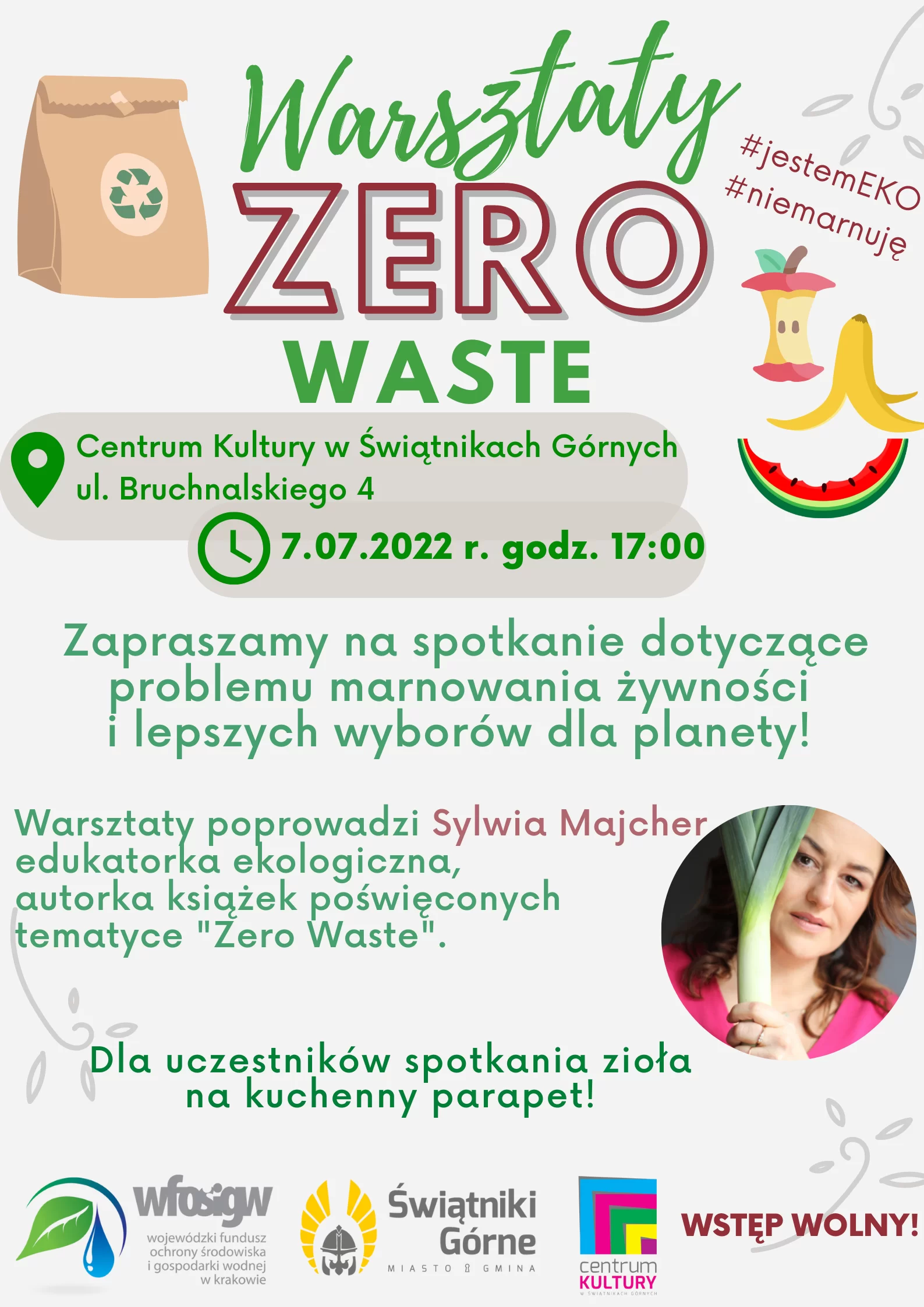 Gmina Świątniki Górne zaprasza na spotkanie nt. niemarnowania żywności, realizowane w ramach projektu "Jestem EKO- bądź i TY" współfinansowanego ze środków Wojewódzkiego Funduszu Ochrony Środowiska i Gospodarki Wodnej w Krakowie.